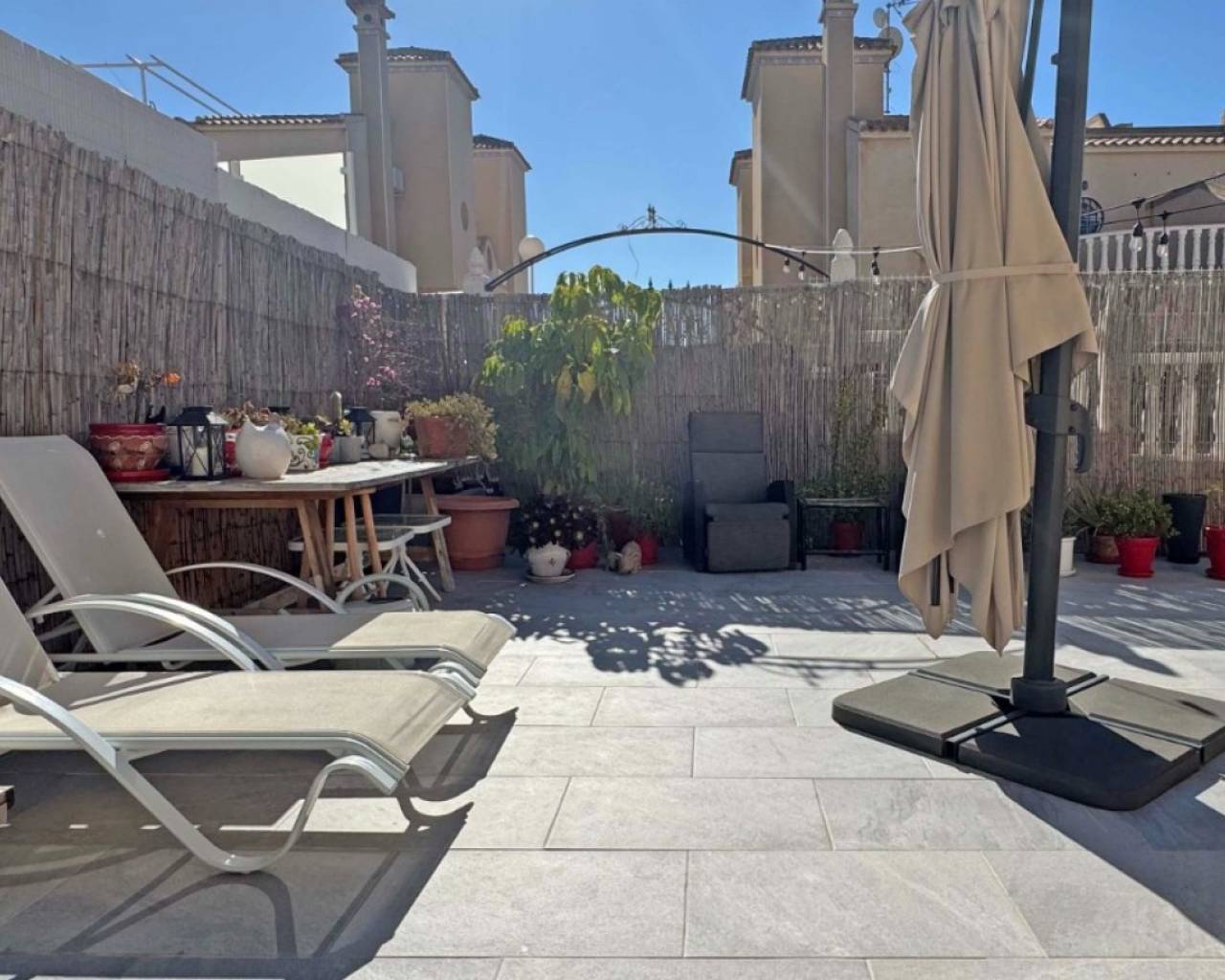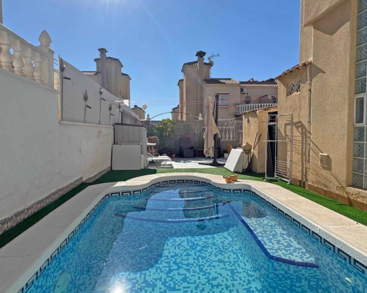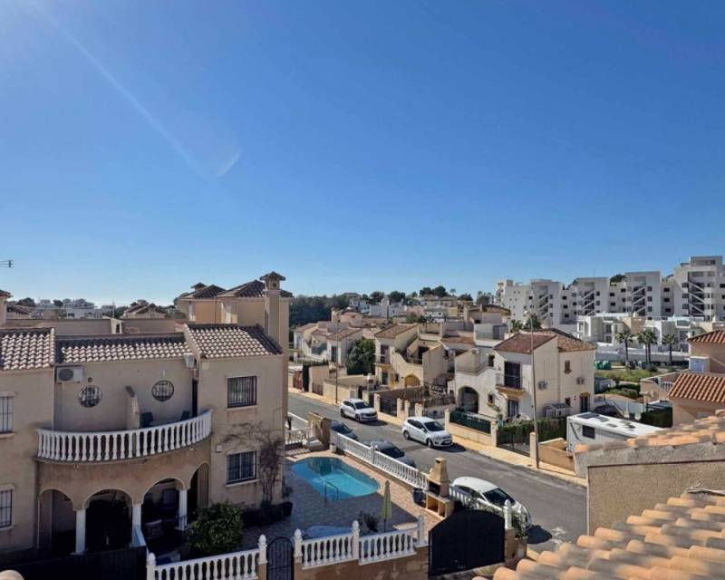 Located in the sought-after Zodiaco V community, this beautifully renovated Zodiaco-style quad villa is an excellent property for sale in Villamartín Orihuela Costa, offering modern living, generous outdoor space, and a fantastic Mediterranean lifestyle close to all amenities. The property has been completely refurbished throughout, including new flooring, modern kitchen, updated bathrooms, electrics, plastering, and contemporary lighting, creating a stylish and move-in-ready home. Set on a spacious private plot, the villa features a large tiled terrace and a private swimming pool with heated Jacuzzi section, perfect for enjoying the Costa Blanca climate all year round. The outdoor space provides plenty of room for sunbathing, outdoor dining, and entertaining guests. Residents also benefit from access to a communal swimming pool within the urbanisation. Inside, the ground floor offers a bright lounge-dining area, a modern fitted kitchen, and a contemporary bathroom with walk-in shower and utility area. Upstairs you will find two double bedrooms with fitted wardrobes and a fully renovated family bathroom. The master bedroom enjoys access to a private balcony. From the landing, stairs lead to the private roof solarium, finished with artificial grass and offering an ideal space for relaxing or entertaining. On this level there is also an additional air-conditioned room, perfect as a third bedroom, home office, or storage space. The villa is located just 500 metres from shops, bars, restaurants, and public transport, while La Fuente commercial centre, Villamartín Plaza, Zenia Boulevard, and several championship golf courses are all within easy reach. Thanks to its excellent location and full renovation, this property is ideal as a home near golf courses and the beaches of Orihuela Costa, and represents an excellent holiday home or investment property in Costa Blanca South.